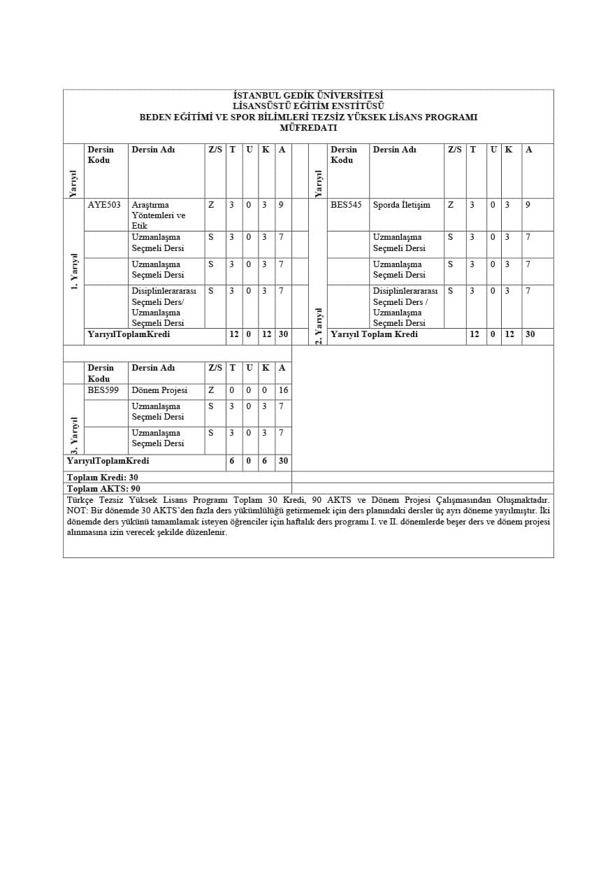 Beden Eğitimi ve Spor Bilimleri alanında sunulan tezsiz yüksek lisans programı, toplamda 30 kredi 10 ders ve bir dönem projesinden meydana gelmektedir. Bu dönem projesi kredisiz olup, sadece "başarılı" veya "başarısız" şeklinde değerlendirilir. Programın tamamlanma süresi minimum iki yarıyıl, maksimum ise üç yarıyıldır. Süre belirlenirken, bilimsel hazırlık aşaması göz önünde bulundurulmamaktadır. Öğrencinin eğitim sürecinde kayıt yenilemediği dönemler, toplam süreye eklenir.
