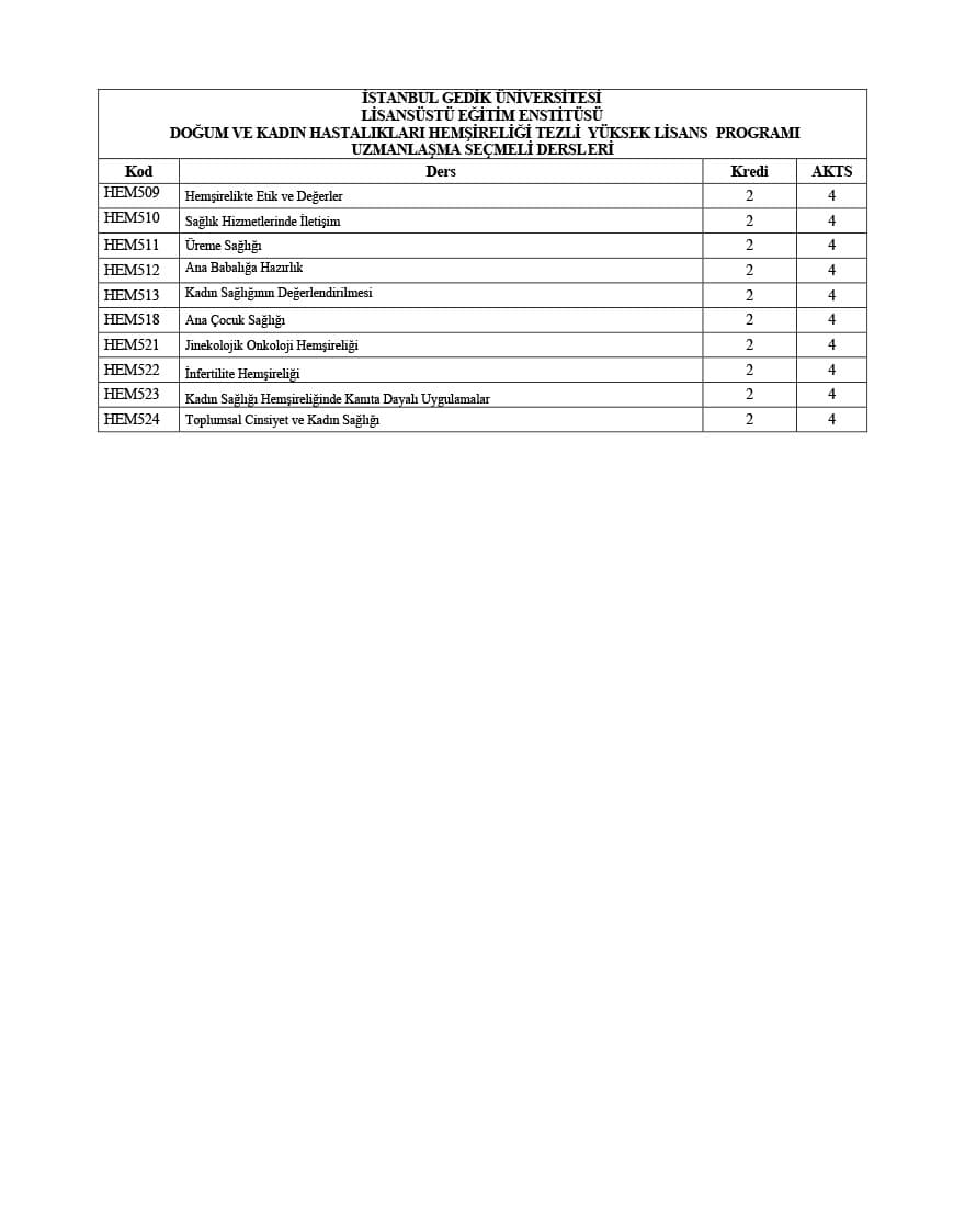 Doğum ve Kadın Hastalıkları Hemşireliği tezli yüksek lisans programı toplam 28 kredilik 10 ders, iki seminer dersi ve iki tez çalışmasından oluşur. Seminer dersleri ve tez çalışması kredisiz olup başarılı veya başarısız olarak notlandırılır. Tezli yüksek lisans programının süresi en az dört, en çok altı yarıyıl olarak uygulanır. Süre hesaplamalarında bilimsel hazırlık programı dikkate alınmaz. Öğrencinin kayıt yaptırmadığı dönemler azami süreye dahil edilir.