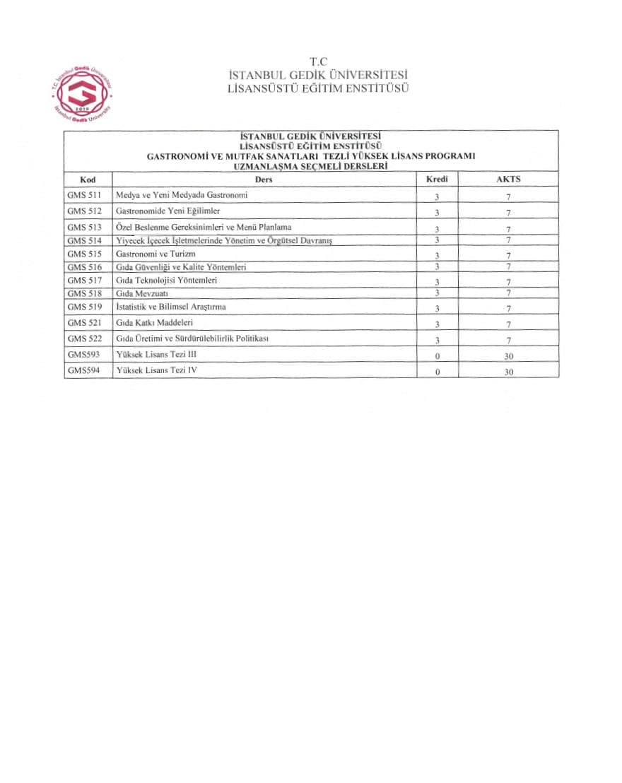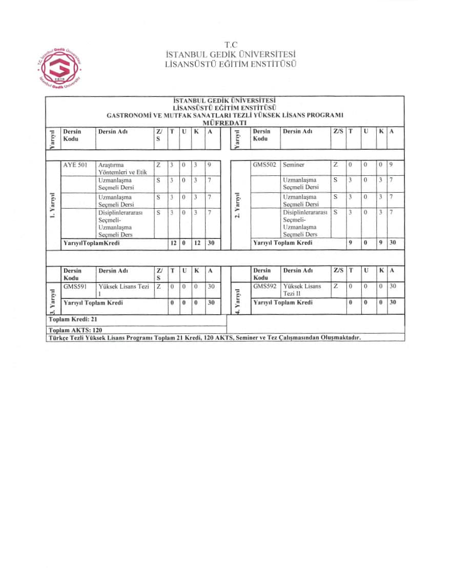 Gastronomi ve Mutfak Sanatları tezli yüksek lisans programı, toplam 21 krediyi kapsayan 7 ders, bir seminer dersi ve tez çalışmasını içermektedir. Seminer dersi ve tez çalışması kredisiz olup, başarılı ya da başarısız şeklinde değerlendirilir. Tezli yüksek lisans programını tamamlama süresi en kısa dört, en uzun ise altı yarıyıl olarak belirlenmiştir. Süre hesaplamalarında bilimsel hazırlık programı göz önünde bulundurulmamaktadır. Öğrencinin kayıt yaptırmadığı dönemler, azami süre hesaplamasına dahil edilmektedir.