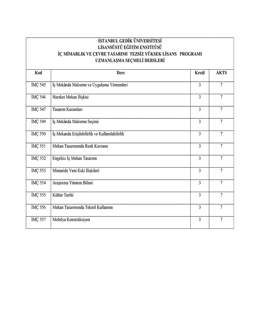 İç Mimarlık alanında sunulan tezsiz yüksek lisans programı, toplam 30 krediden oluşup 10 ders ve bir dönem projesiyle şekillenir. Bu dönem projesi için ayrı bir kredi verilmemekte ve "başarılı" ya da "başarısız" şeklinde değerlendirilmektedir. Bu yüksek lisans programını tamamlama süreci minimum iki yarıyılken, maksimum üç yarıyıla kadar uzayabilir. Süre belirlenirken, bilimsel hazırlık aşaması hesaba katılmamaktadır. Öğrencinin eğitime ara verdiği ya da kayıt yenilemediği dönemler, azami eğitim süresine eklenmektedir.