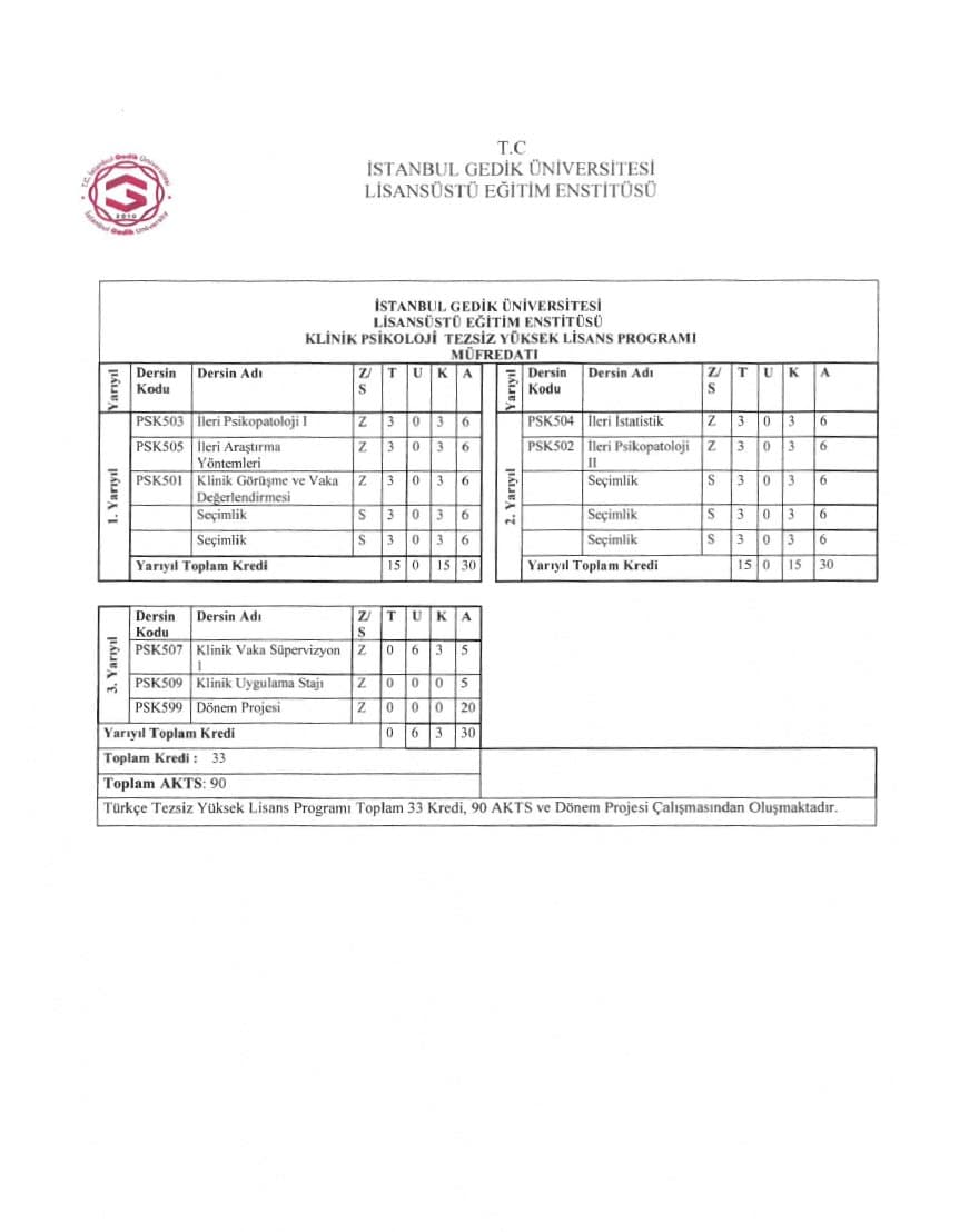 Klinik Psikoloji tezsiz yüksek lisans programı, toplamda 36 krediden oluşmaktayken 10 ders, staj, süpervizyon ve dönem projesi çalışmalarını içermektedir. Dönem projesi, kredisizdir ve başarı durumu (başarılı veya başarısız) olarak değerlendirilir. Tezsiz yüksek lisans programının tamamlama süresi minimum iki yarıyıl, maksimum üç yarıyıldır. Süre hesaplamalarında bilimsel hazırlık programı dikkate alınmaz ve öğrencinin kayıt yaptırmadığı dönemler, programın azami süresine dahil edilir.