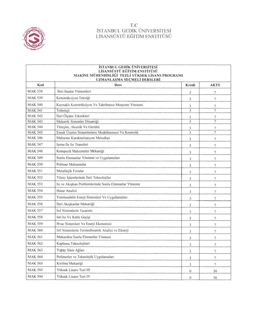 Makine Mühendisliği tezli yüksek lisans programı toplam 21 kredilik 7 ders, bir seminer dersi ve tez çalışmasından oluşur. Seminer dersi ve tez çalışması kredisiz olup başarılı veya başarısız olarak notlandırılır. Tezli yüksek lisans programının süresi en az dört, en çok altı yarıyıl olarak planlanmıştır. Süre hesaplamalarında bilimsel hazırlık programı dikkate alınmaz. Öğrencinin kayıt yaptırmadığı dönemler azami süreye dahil edilir.