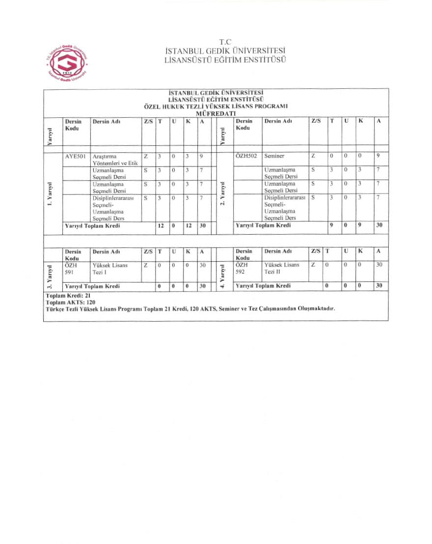 Özel Hukuk Tezli Yüksek Lisans Programı'na kaydolan öğrenciler, ilgi alanlarına göre Medeni Hukuk, Borçlar Hukuku, Kara Ticareti Hukuku, Deniz Ticareti Hukuku, İş Hukuku, Marka ve Patent Hukuku, Sigorta Hukuku, Usul Hukuku gibi çeşitli hukuk dallarında lisansüstü düzeyde araştırma ve yayın yapma yetenekleri kazanacaklardır.