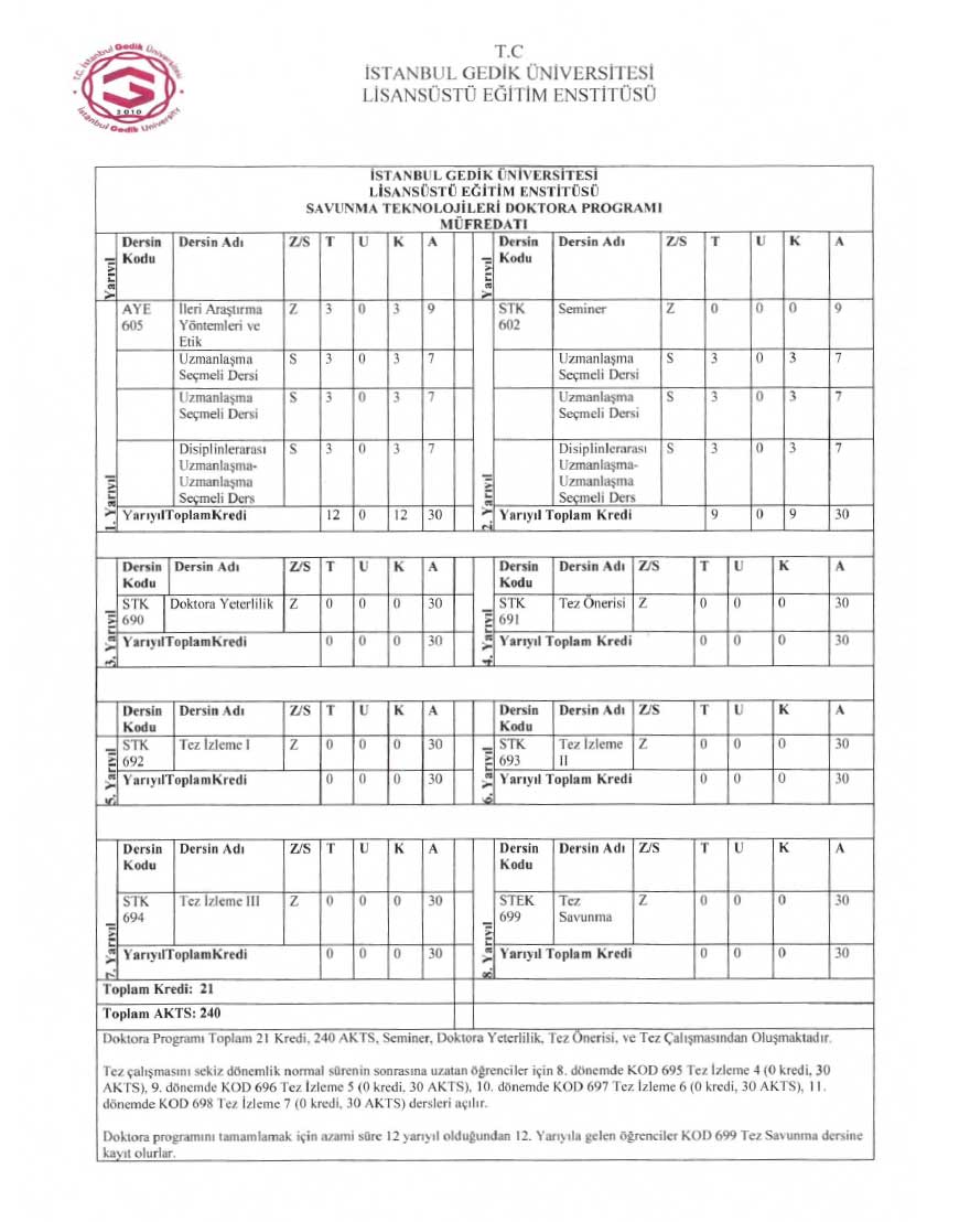 Savunma Teknolojileri Doktora Programı toplam 21 kredilik 7 ders ve bir seminer dersi ile doktora yeterlik, tez önerisi, tez izleme ve tez savunma aşamalarını içeren tez çalışmasından oluşur. Doktora programının süresi en az sekiz, en çok on iki yarıyıldır. Süre hesaplamalarında bilimsel hazırlık programı dikkate alınmaz.