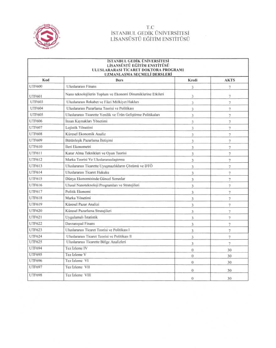 Uluslararası Ticaret Doktora Programı toplam 21 kredilik 7 ders ve bir seminer dersi ile doktora yeterlik, tez önerisi, tez izleme ve tez savunma aşamalarını içeren tez çalışmasından oluşur. Seminer dersi ve tez çalışmasını içeren aşamalar kredisiz olup başarılı veya başarısız olarak notlandırılır. Doktora programının süresi en az sekiz, en çok on iki yarıyıldır. Süre hesaplamalarında bilimsel hazırlık programı dikkate alınmaz.
