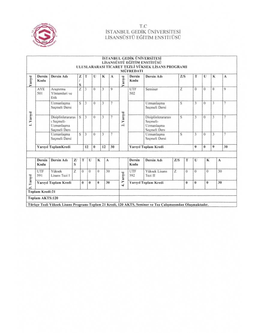 Uluslararası Ticaret Tezli Yüksek Lisans Programı, toplam 21 kredilik 7 ders, bir seminer dersi ve tez çalışmasından oluşmaktadır. Seminer dersi ve tez çalışması kredisizdir ve başarılı veya başarısız olarak notlandırılır. Tezli yüksek lisans programının süresi en az dört, en fazla altı yarıyıl olarak belirlenmiştir. Süre hesaplamalarında bilimsel hazırlık programı dikkate alınmaz. Öğrencinin kayıt yaptırmadığı dönemler azami süreye dahil edilir.