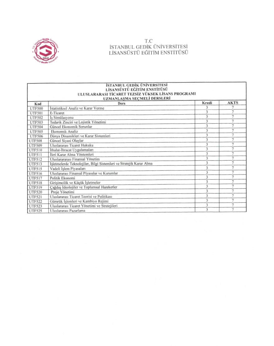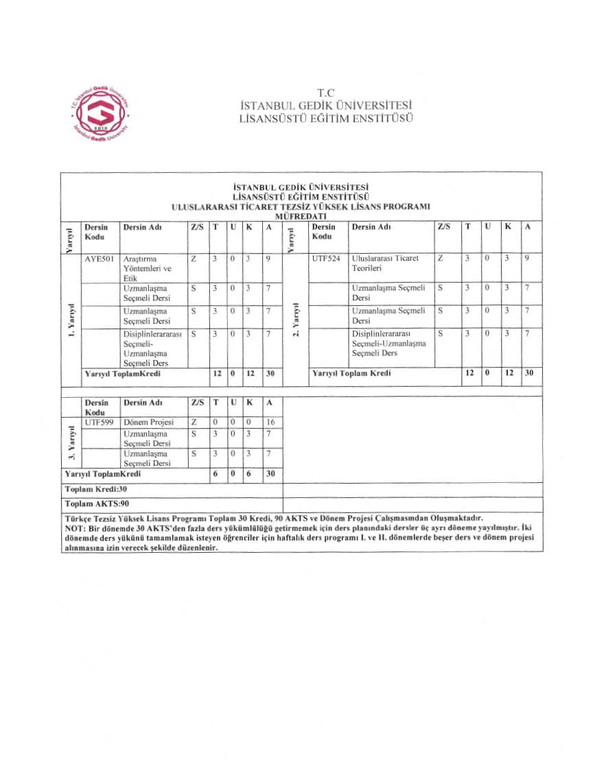 Uluslararası Ticaret Tezsiz Yüksek Lisans Programı, toplamda 10 dersi ve bir dönem projesini kapsayan 30 kredilik bir yapıya sahiptir. Dönem projesi için ayrı bir kredi tahsis edilmemekte ve bu proje "başarılı" ya da "başarısız" şeklinde değerlendirilir. Programın tamamlanma süresi minimum iki yarıyıl olup, maksimuma üç yarıyıl kadar sürebilir. Program süresi belirlenirken, bilimsel hazırlık dönemi göz önünde bulundurulmamaktadır. Öğrencinin eğitime ara verdiği veya kayıt yenilemediği dönemler, toplam süre içerisine eklenir.