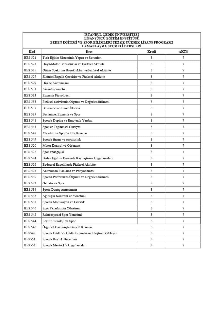 Beden Eğitimi ve Spor Bilimleri alanında sunulan tezsiz yüksek lisans programı, toplamda 30 kredi 10 ders ve bir dönem projesinden meydana gelmektedir. Bu dönem projesi kredisiz olup, sadece "başarılı" veya "başarısız" şeklinde değerlendirilir. Programın tamamlanma süresi minimum iki yarıyıl, maksimum ise üç yarıyıldır. Süre belirlenirken, bilimsel hazırlık aşaması göz önünde bulundurulmamaktadır. Öğrencinin eğitim sürecinde kayıt yenilemediği dönemler, toplam süreye eklenir.
