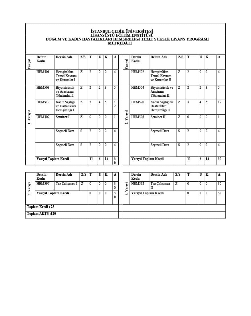 Doğum ve Kadın Hastalıkları Hemşireliği tezli yüksek lisans programı toplam 28 kredilik 10 ders, iki seminer dersi ve iki tez çalışmasından oluşur. Seminer dersleri ve tez çalışması kredisiz olup başarılı veya başarısız olarak notlandırılır. Tezli yüksek lisans programının süresi en az dört, en çok altı yarıyıl olarak uygulanır. Süre hesaplamalarında bilimsel hazırlık programı dikkate alınmaz. Öğrencinin kayıt yaptırmadığı dönemler azami süreye dahil edilir.