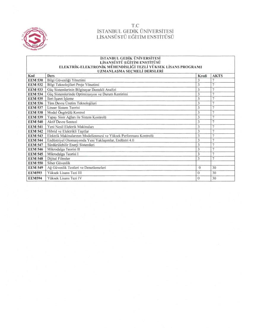 Elektrik-Elektronik Mühendisliği uzmanlık programı, 21 kredi değerinde toplam 7 ders, bir seminer ve tez projesinden meydana gelir. Seminer ve tez projeleri kredi değeri taşımaz; sadece başarılı veya başarısız olarak değerlendirilir. Uzmanlık eğitimi süreci en kısa dört yarıyılda tamamlanabilirken, en fazla altı yarıyıla kadar uzayabilir. Süre hesaplamalarında bilimsel hazırlık programı dikkate alınmaz. Öğrencinin kayıt yaptırmadığı dönemler azami süreye dahil edilir.
