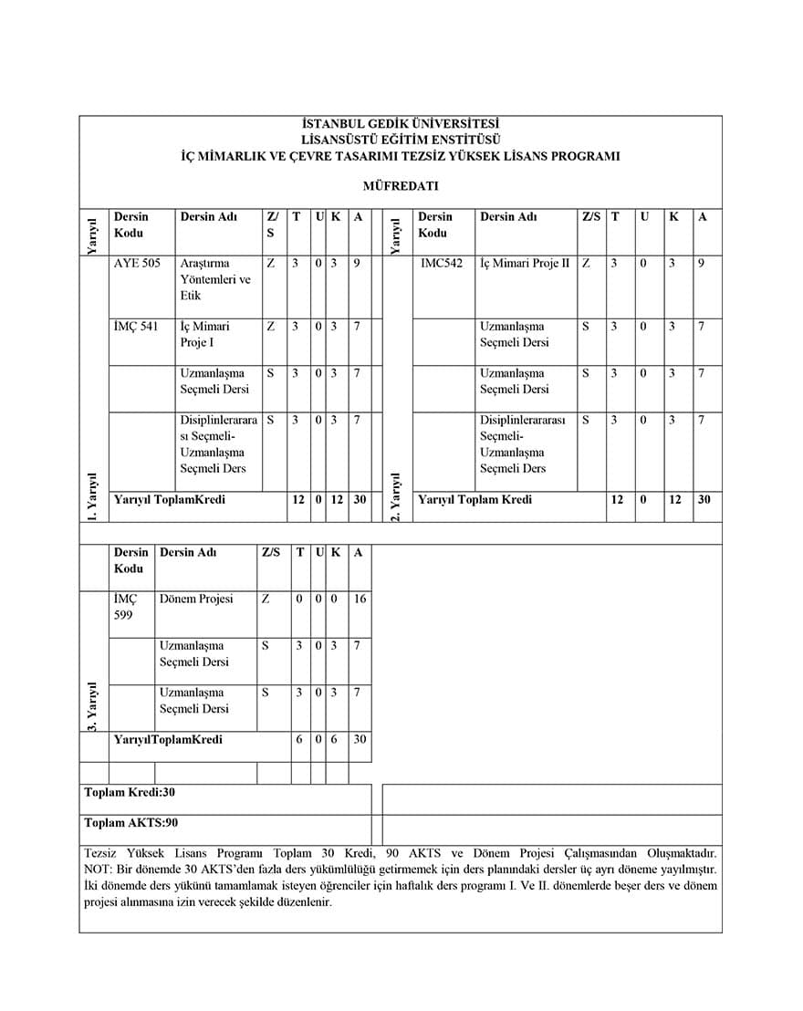 İç Mimarlık alanında sunulan tezsiz yüksek lisans programı, toplam 30 krediden oluşup 10 ders ve bir dönem projesiyle şekillenir. Bu dönem projesi için ayrı bir kredi verilmemekte ve "başarılı" ya da "başarısız" şeklinde değerlendirilmektedir. Bu yüksek lisans programını tamamlama süreci minimum iki yarıyılken, maksimum üç yarıyıla kadar uzayabilir. Süre belirlenirken, bilimsel hazırlık aşaması hesaba katılmamaktadır. Öğrencinin eğitime ara verdiği ya da kayıt yenilemediği dönemler, azami eğitim süresine eklenmektedir.