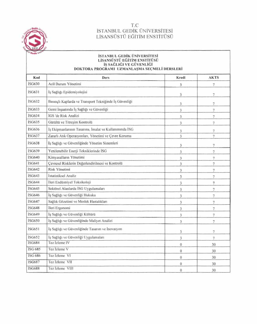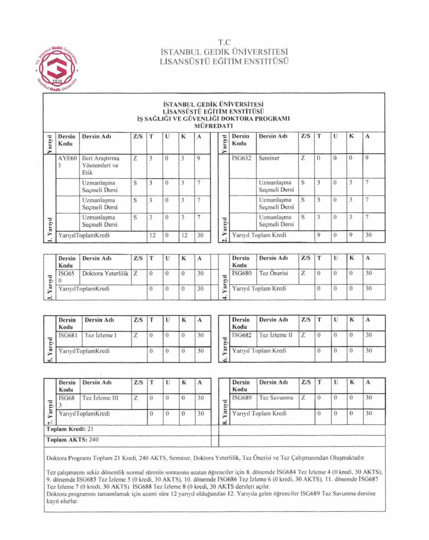 İş Sağlığı ve Güvenliği Doktora Programı toplam 21 kredilik 7 ders ve bir seminer dersi ile doktora yeterlik, tez önerisi, tez izleme ve tez savunma aşamalarını içeren tez çalışmasından oluşur. Doktora programının süresi en az sekiz, en çok on iki yarıyıldır. Süre hesaplamalarında bilimsel hazırlık programı dikkate alınmaz.