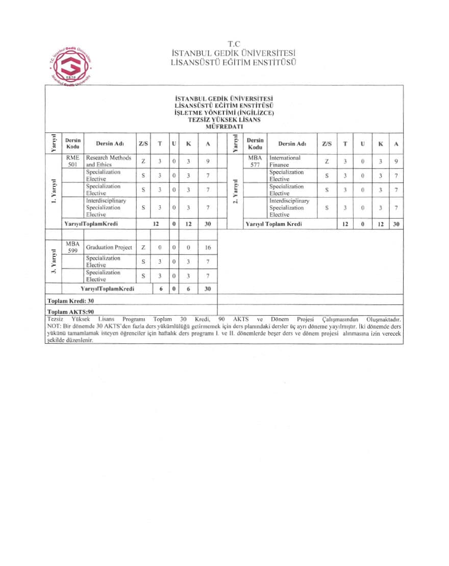İşletme Yönetimi İngilizce/Tezsiz Yüksek Lisans Programımız, toplamda 30 kredilik 10 ders ve bir dönem projesinden oluşmaktadır. Program, en az iki, en fazla üç yarıyıl süreyle tamamlanabilir. Süre hesaplamalarında bilimsel hazırlık programı dikkate alınmaz ve öğrencinin kayıt yaptırmadığı dönemler azami süreye dahil edilir.