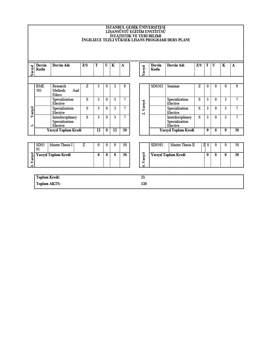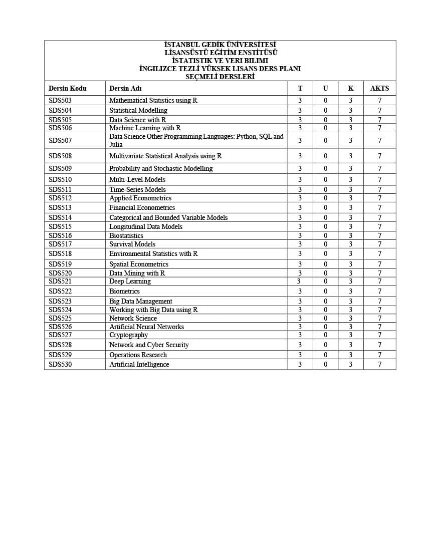 İstatistik ve Veri Bilimi Tezli (İngilizce) Yüksek Lisans Programı, toplam 30 kredilik 10 ders ve bir dönem projesinden oluşmaktadır. Dönem projesi kredisizdir ve başarılı veya başarısız olarak değerlendirilir. Tezsiz yüksek lisans programının süresi en az iki, en çok üç yarıyıldır. Süre hesaplamalarında bilimsel hazırlık programı dikkate alınmaz ve öğrencinin kayıt yaptırmadığı dönemler azami süreye dahil edilir.