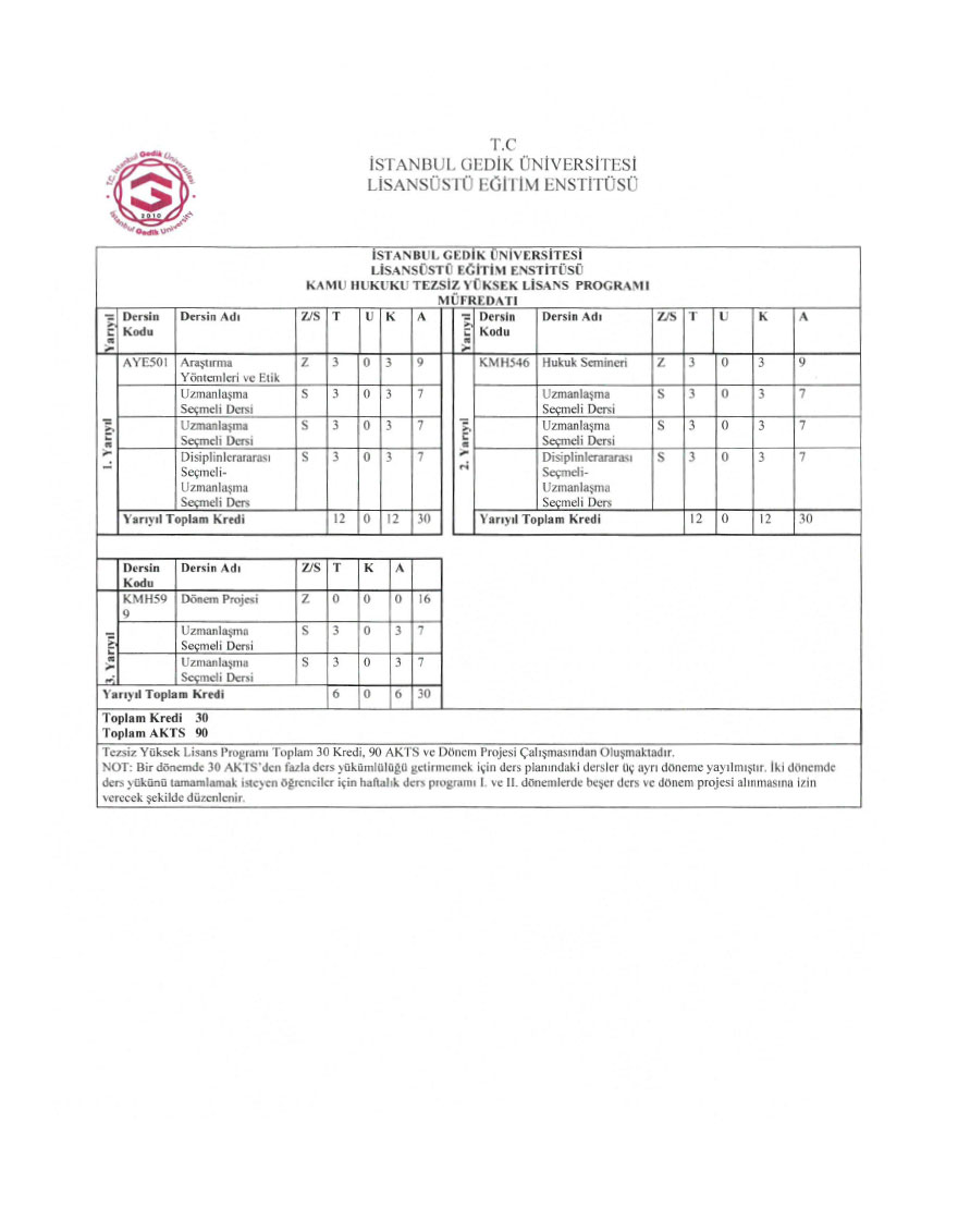Kamu Hukuku tezsiz yüksek lisans programı, toplamda 30 kredi değerinde 10 ders ile bir dönem projesinden meydana gelir. Bu dönem projesi herhangi bir kredi değeri taşımaz başarılı ya da başarısız şeklinde değerlendirilir. Programın tamamlanma süresi minimum iki yarıyılken maksimum üç yarıyıla kadar uzayabilir. Süre hesaplamalarında bilimsel hazırlık programı dikkate alınmaz. Öğrencinin eğitime ara verdiği dönemler de azami süre içerisinde sayılmaktadır.