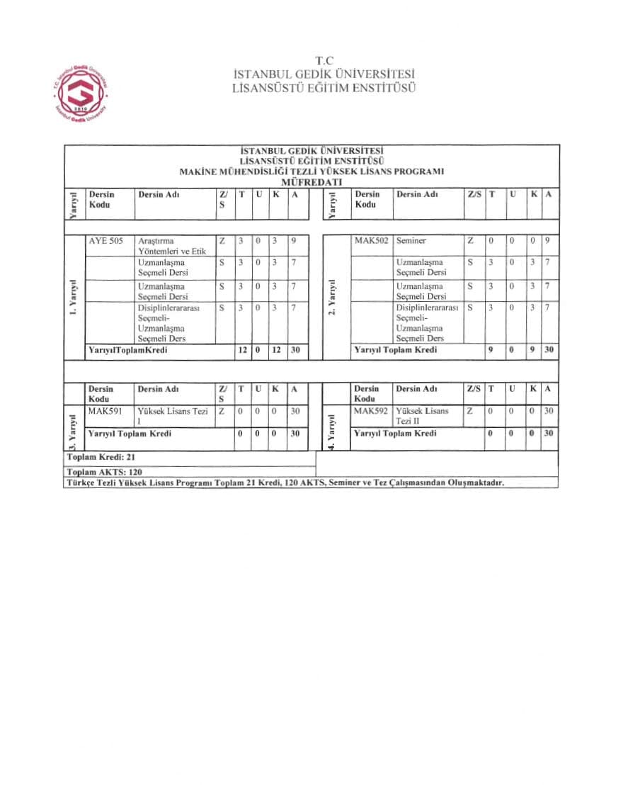 Makine Mühendisliği tezli yüksek lisans programı toplam 21 kredilik 7 ders, bir seminer dersi ve tez çalışmasından oluşur. Seminer dersi ve tez çalışması kredisiz olup başarılı veya başarısız olarak notlandırılır. Tezli yüksek lisans programının süresi en az dört, en çok altı yarıyıl olarak planlanmıştır. Süre hesaplamalarında bilimsel hazırlık programı dikkate alınmaz. Öğrencinin kayıt yaptırmadığı dönemler azami süreye dahil edilir.