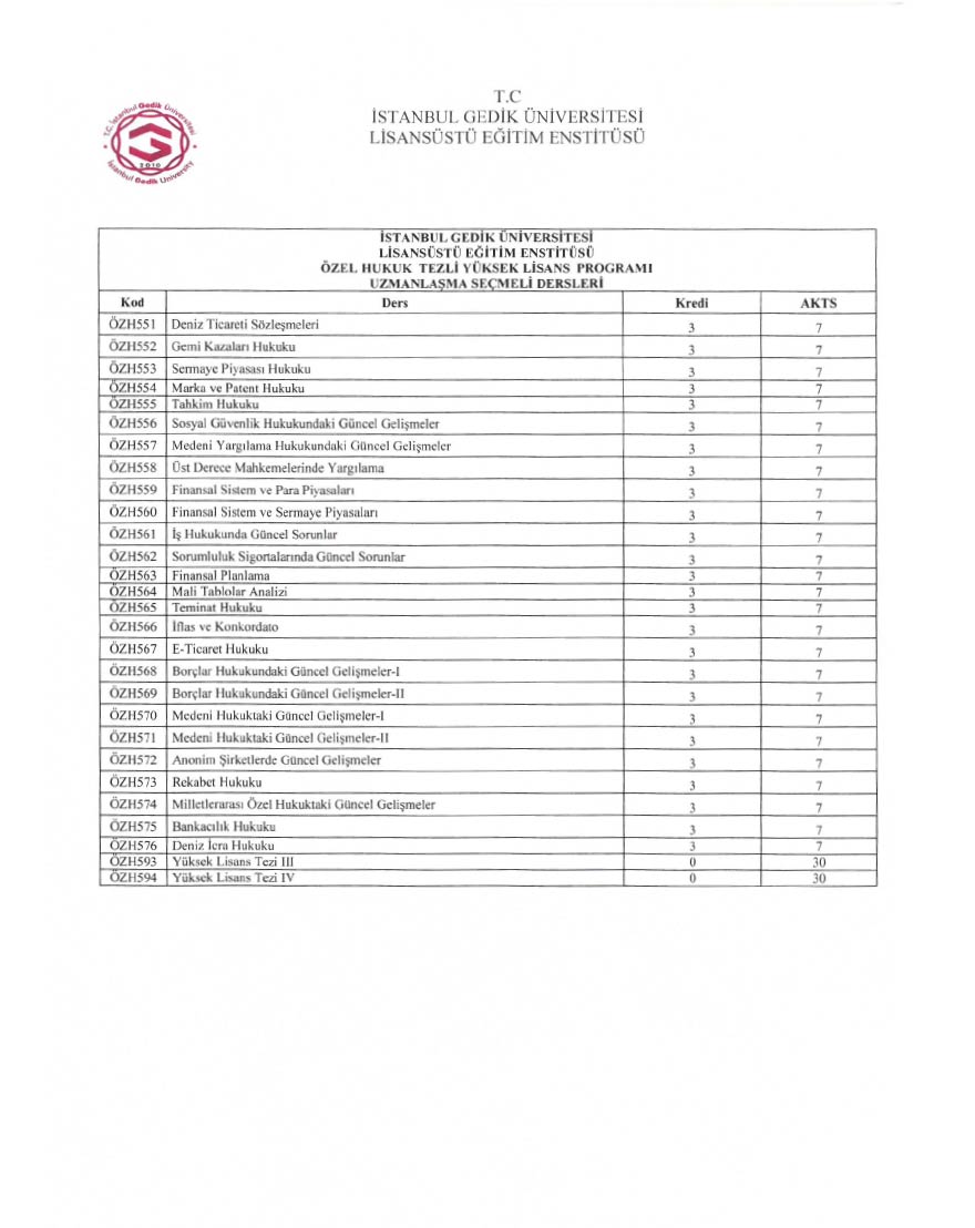 Özel Hukuk Tezli Yüksek Lisans Programı'na kaydolan öğrenciler, ilgi alanlarına göre Medeni Hukuk, Borçlar Hukuku, Kara Ticareti Hukuku, Deniz Ticareti Hukuku, İş Hukuku, Marka ve Patent Hukuku, Sigorta Hukuku, Usul Hukuku gibi çeşitli hukuk dallarında lisansüstü düzeyde araştırma ve yayın yapma yetenekleri kazanacaklardır.