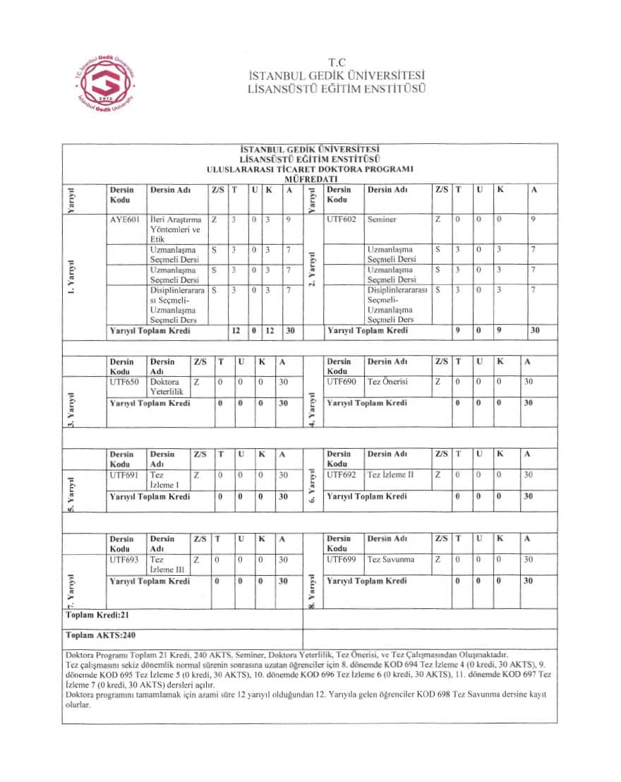 Uluslararası Ticaret Doktora Programı toplam 21 kredilik 7 ders ve bir seminer dersi ile doktora yeterlik, tez önerisi, tez izleme ve tez savunma aşamalarını içeren tez çalışmasından oluşur. Seminer dersi ve tez çalışmasını içeren aşamalar kredisiz olup başarılı veya başarısız olarak notlandırılır. Doktora programının süresi en az sekiz, en çok on iki yarıyıldır. Süre hesaplamalarında bilimsel hazırlık programı dikkate alınmaz.