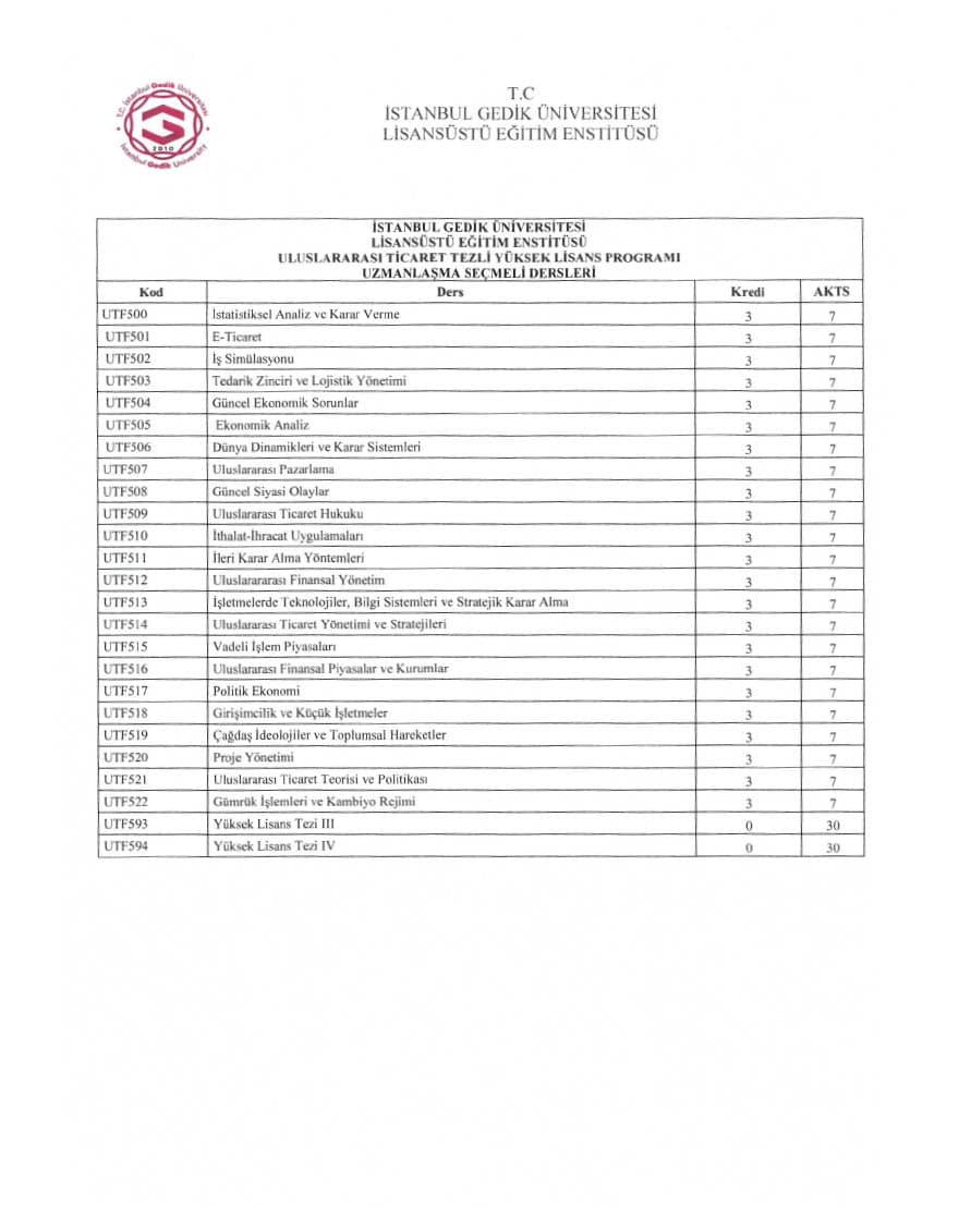 Uluslararası Ticaret Tezli Yüksek Lisans Programı, toplam 21 kredilik 7 ders, bir seminer dersi ve tez çalışmasından oluşmaktadır. Seminer dersi ve tez çalışması kredisizdir ve başarılı veya başarısız olarak notlandırılır. Tezli yüksek lisans programının süresi en az dört, en fazla altı yarıyıl olarak belirlenmiştir. Süre hesaplamalarında bilimsel hazırlık programı dikkate alınmaz. Öğrencinin kayıt yaptırmadığı dönemler azami süreye dahil edilir.